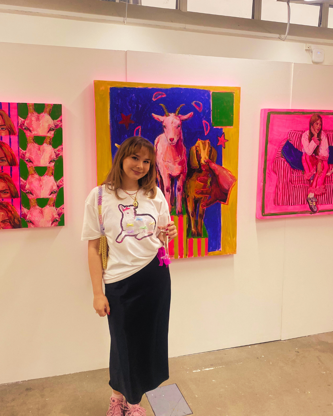 “I am an emerging artist having graduated from Liverpool John Moores with a BA in Fine Art. Originally from a farm in North Yorkshire, my rural upbringing has deeply influenced my practice. My work consists of vibrant, large scale figurative oil paintings, realised on a neon pink acrylic base accompanied by textural oil stick and oil pastel. Playful use of colour blurs fiction and reality, in artificial hues at odds with the natural environment or traditional palettes utilised in landscape and animal painting. Incorporating goats reflects my farming background where I developed my own personal connections with them as companions. In this environment I have reflected on dominant societal ideas of animals being perceived as commodities, and the ways in which their life and death are integrated into every day. This context continues to sustain my inquiry into the innate human desire for connections and encounters with animals albeit a relationship hindered by complexities of hierarchy and domestication; using the writings of feminist scholar Donna Haraway as guiding principle. My constant interrogation of the subject informs a research-based practice wholly applied to the act of painting, contributing to a developing practice encouraging experimentation, firmly committed to critical reflection.”